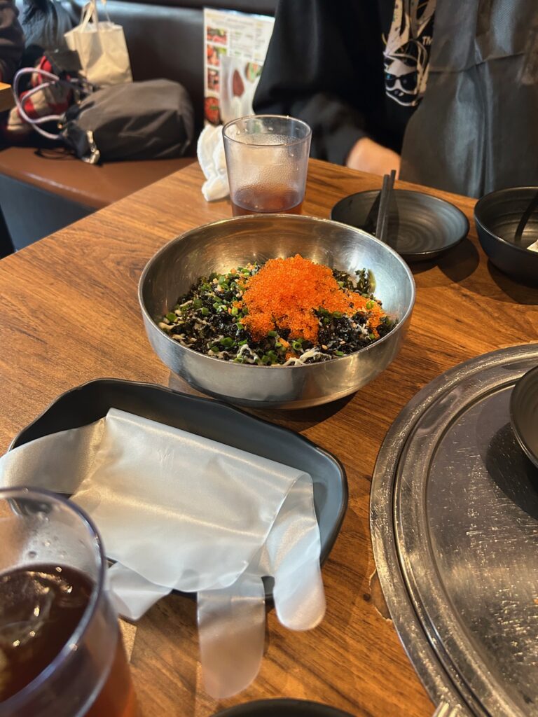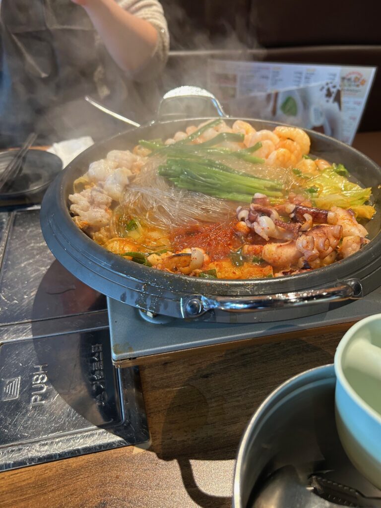 新大久保には本格的な韓国料理店が数多くあり、どの店に入るか迷うほどです。今回私が訪れたのは、ヨプの王豚という人気の店で、ナッコプセ(ナクチ=タコ、コプチャン=ホルモン、セウ=エビを炒めた料理)を注文しました。