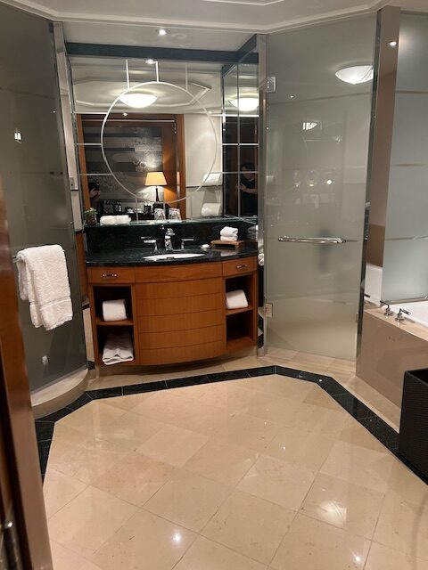 客室は広々としており、インテリアは日本の伝統美とモダンなデザインが融合したスタイルです。ベッドは極上の寝心地で、バスルームは大理石で仕上げられており、バスタブとレインシャワーが備わっています。まさに至福のひとときでした。
